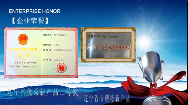 碳纖維可紡瀝青 榮獲遼寧省優秀新產品二等獎、 遼寧省專精特新產品獎。企業為國家級專精特新“小巨人”企業、遼寧省專精特新“小巨人”企業、遼寧省高新技術企業、遼寧省創新型企業;曾連續多年榮獲遼寧省守合同重信用企業;遼寧省民營經濟統計先進單位;遼陽市高成長性20強企業、五一勞動獎狀。